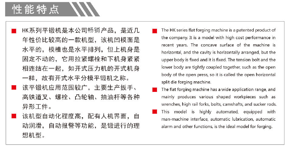 HK系列平鍛機(jī),是近幾年性價(jià)比較高的一-款機(jī)型,該機(jī)凹模面是水平的,模槽也是水平排列,但上機(jī)身是固定不動(dòng)的,它用拉緊螺栓和下機(jī)身緊緊相連結(jié)在一-起,如開式壓力機(jī)的開式機(jī)身-樣,故有開式水平分模平鍛機(jī)之稱。該平鍛機(jī)應(yīng)用范圍較廣,主要生產(chǎn)扳手、高鐵道叉、螺栓、凸輪軸、抽油桿等各種異形工件。